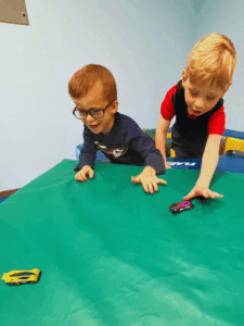 Students raced Matchbox cars, practicing stop/go directions, taking turns, and moving in and out of play spaces. They had a blast exploring movement, waiting, and playing together!