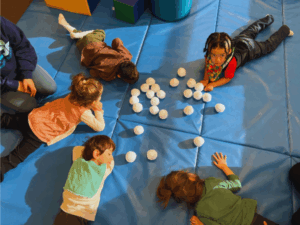 Students enjoyed a snowball fight experience, moving outside their chairs to explore gravity, movement, and connection with friends.